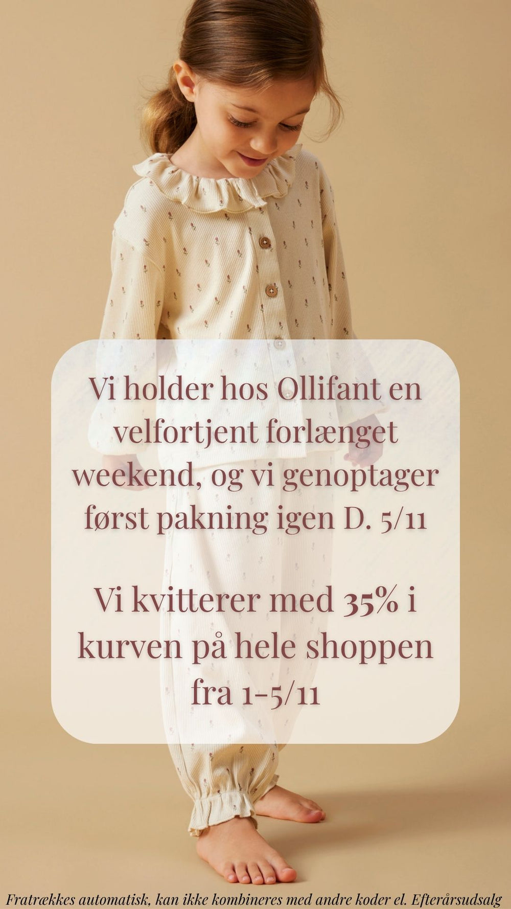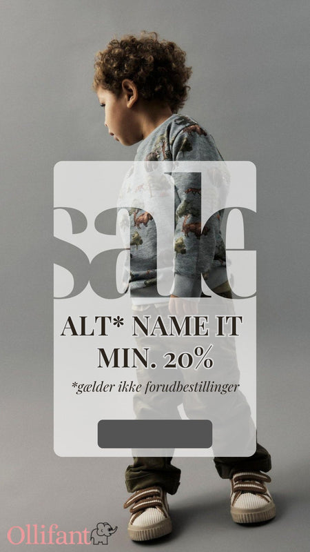 Hos Ollifant forhandler vi et bredt udvalg af de mest populære brands og i højeste kvalitet. Vi har babytøj og børnetøj til børn i alderen 0-8 år. Vi forhandler bl.a. mærker som Lil'Atelier, That's Mine, Bibs, Wheat og mange flere. Hos os får du hurtig levering på 1-3 dage. Bestiller du for over 499 kr, får du fri fragt. Vores mål er at give dig og dit barn den bedste oplevelse og derfor gør vi også alt hvad vi kan for at opfylde dette, hvilket afspejler sig på Trustpilot. Vi tilbyder også delbetaling